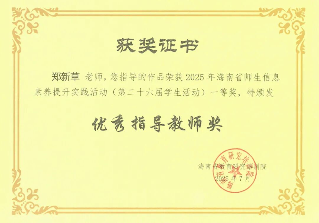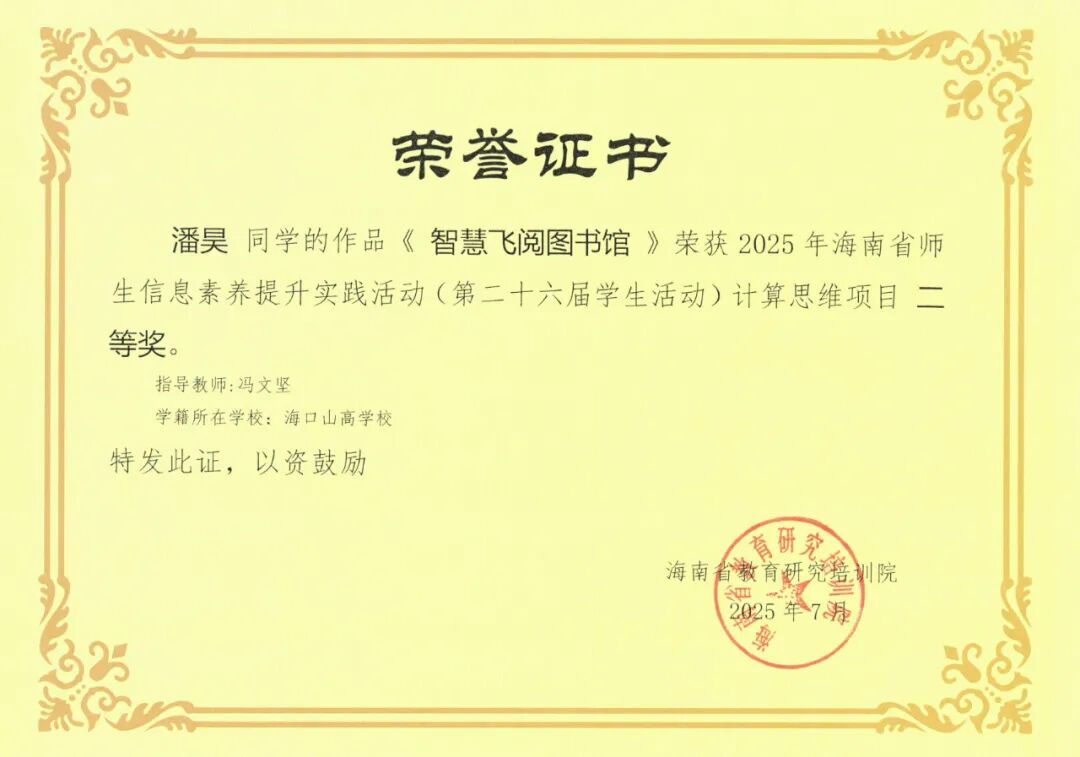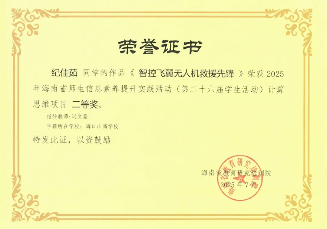 近日,2025年海南省师生信息素养提升实践活动(第二十六届学生活动)圆满落幕。在这场全省范围内的高水平赛事中,我校学子与指导教师凭借扎实的知识储备、出色的实践能力和创新的思维方式,在计算思维项目中脱颖而出,一举斩获多个奖项,捷报频传,为校争光!