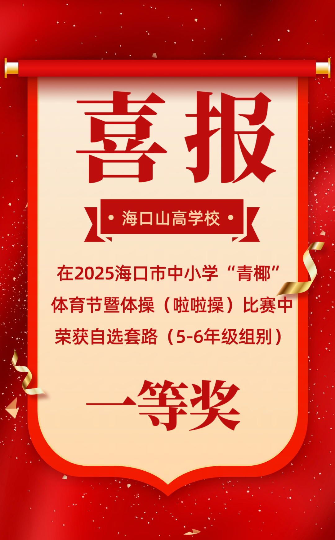 在2025年海口市中小学“青椰”体育节暨体操(啦啦操)比赛中,我校啦啦操队凭借卓越实力惊艳全场,荣获自选套路(5-6年级组别)一等奖!为山高再添光彩!