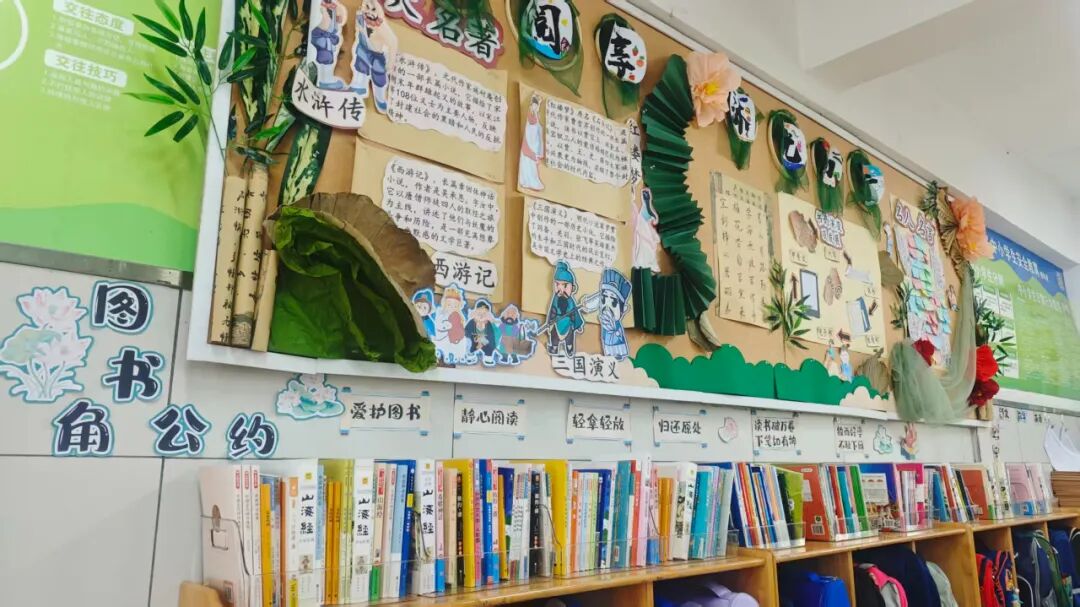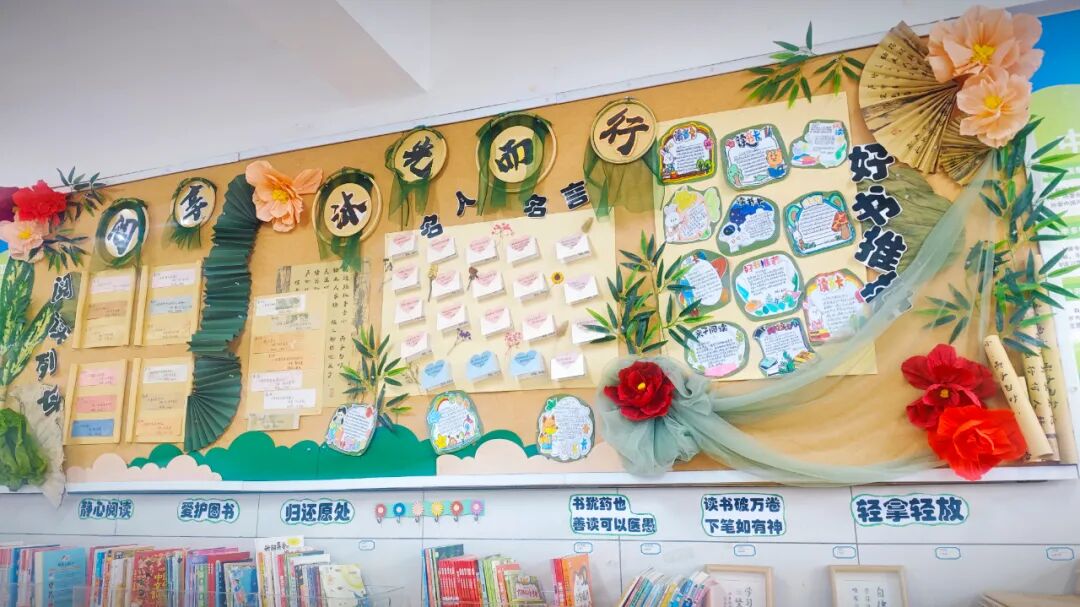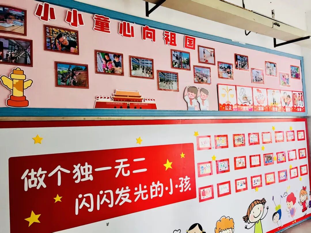 四年级主题是“阅享·沐光而行”,引导学生通过阅读汲取智慧,在劳动中践行所学。环境布置注重传递“从追光少年到发光未来”的成长理念,将个人成长与爱国爱党情怀自然融合。