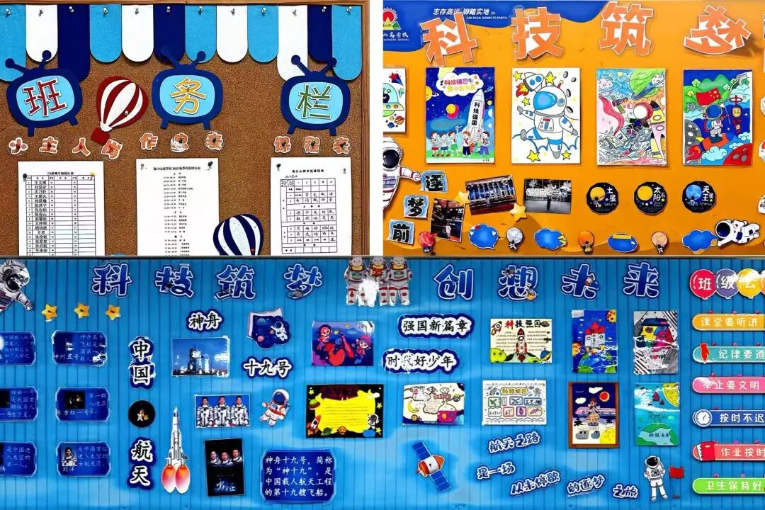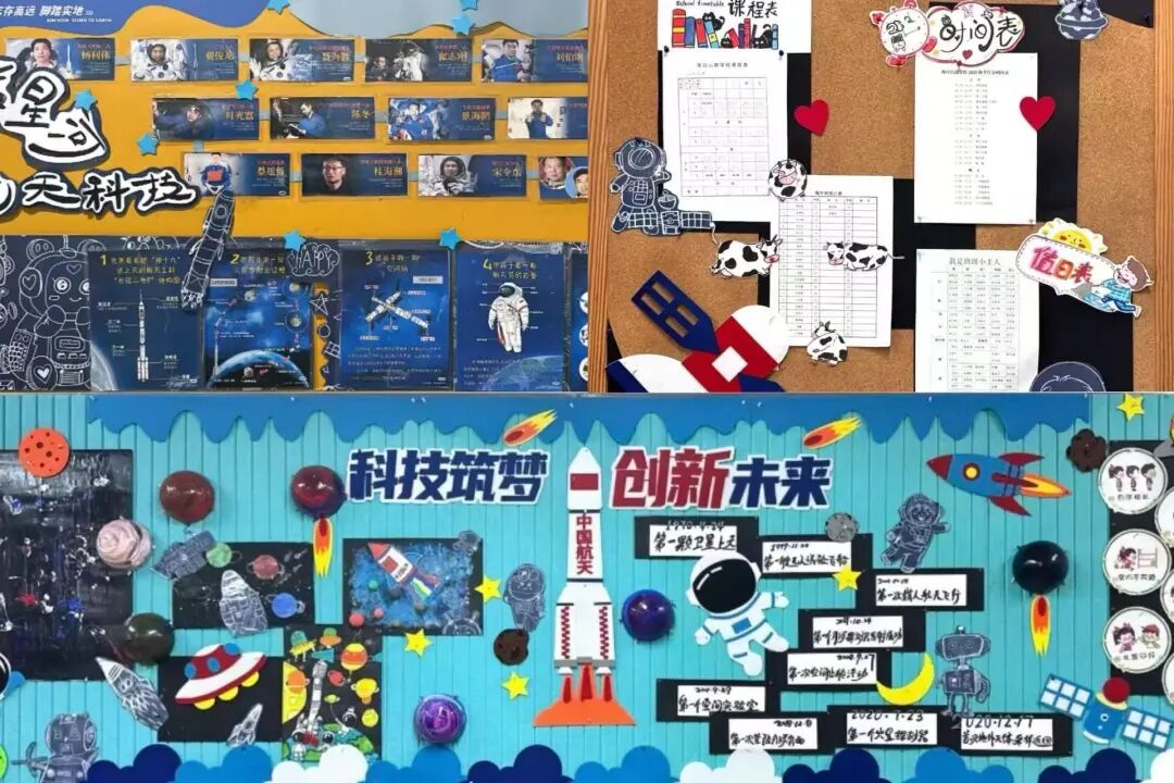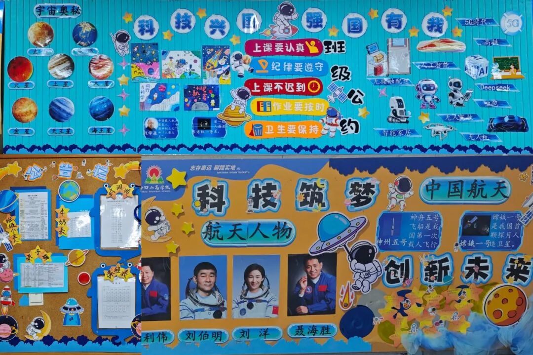 三年级以“科技筑梦、创想未来”为核心,打造沉浸式科技教室。学生自主创作的航天器模型细节满满,星空板报绚丽多彩,整体布置兼具知识性与互动性,激发学生探索热情。